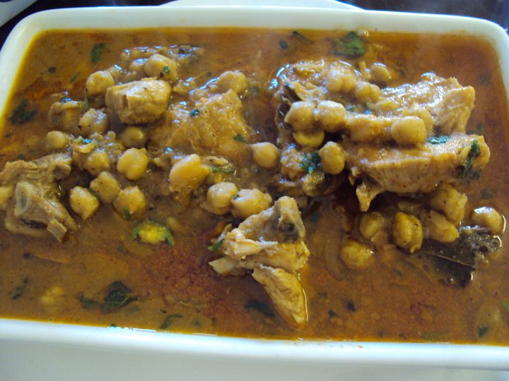 5- When chicken are tender add boiled chickpeas and also add two cup of water